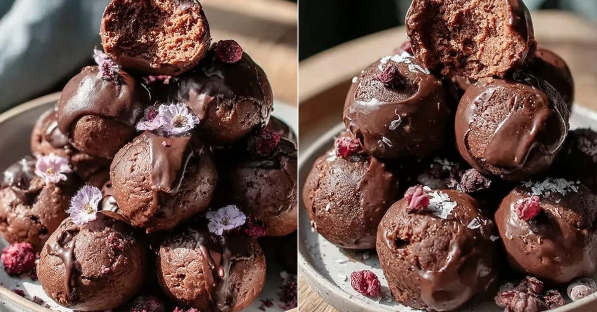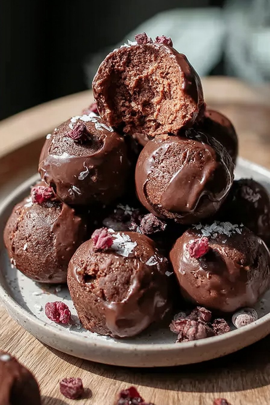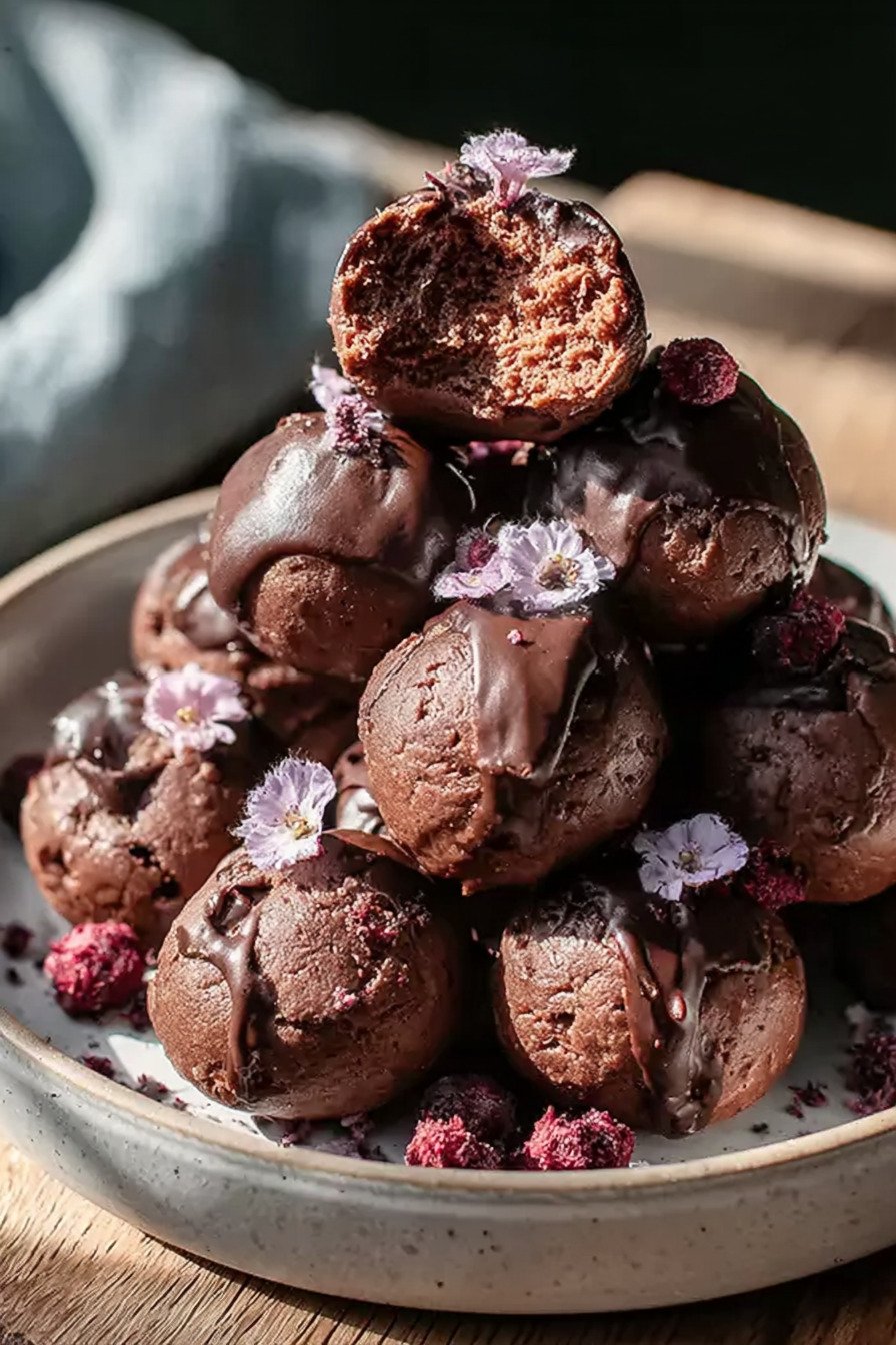 Schritt fünf Servieren, wenn die Oberfläche trocken wirkt. Die Kugeln bleiben innen weich und schmecken nach intensiver Schokolade.