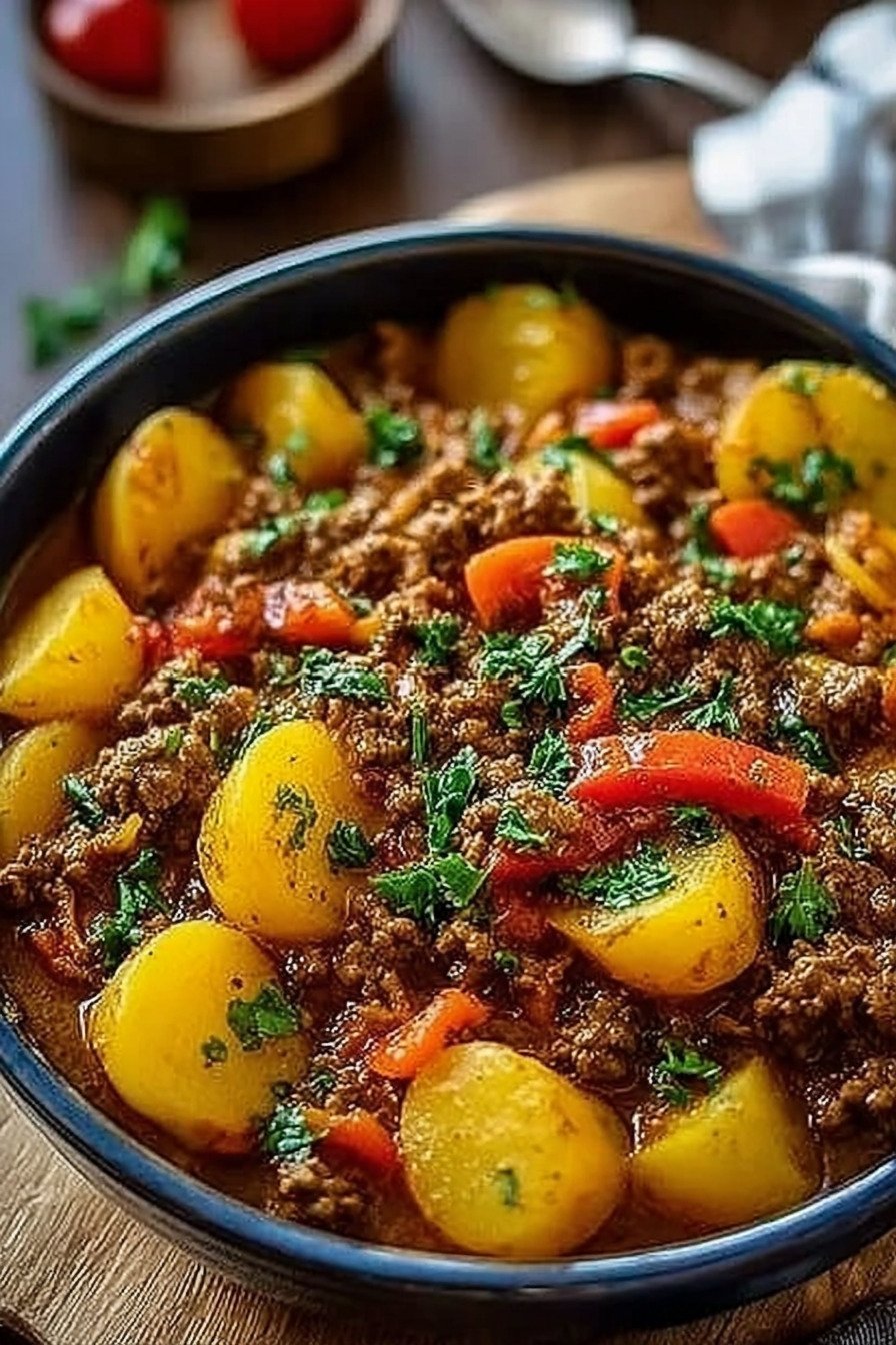 Die Würze trägt Paprika und Tomate. Kartoffeln liefern Sättigung, Hack bringt Röstaromen. Alles backt in einer Form, der Abwasch bleibt klein.