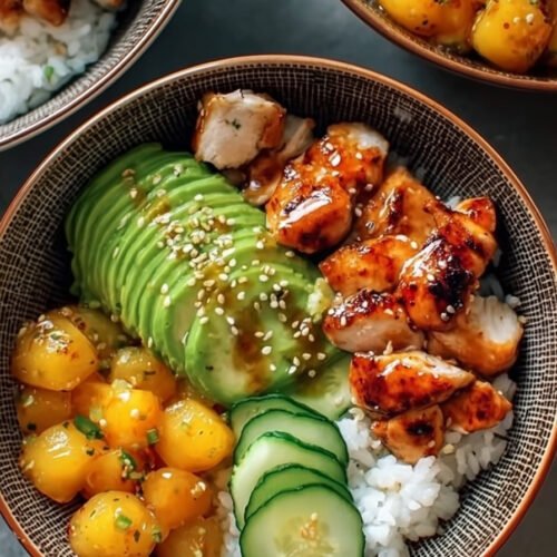 - Ein schnelles Bowl Rezepte Mittagessen mit saftigem Hähnchen und frischem Gemüse.