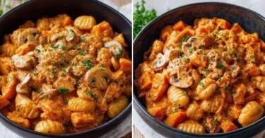 Kürbis Rezept Gnocchi Pfanne mit Champignons und cremiger Soße