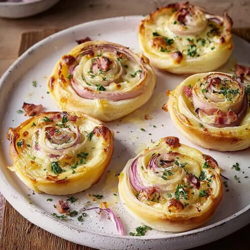 Flammkuchen Schnecken sind eine der einfachsten Möglichkeiten, Gäste mit einem besonderen Snack zu überraschen. Der Blätterteig bildet die Basis und sorgt für die knusprige Textur. Mit Crème fraîche, Zwiebeln, Speck und Käse ergibt sich ein würziger Belag, der durch das Aufrollen seine typische Form erhält. Dieses Rezept verbindet die Leichtigkeit der Zubereitung mit einem intensiven Geschmackserlebnis.