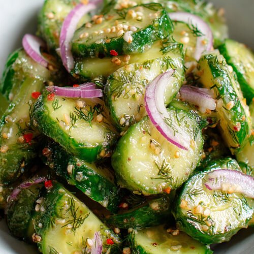 Dieser Salat kühlt, knackt und passt zu vielen Gerichten. Er entsteht schnell und schmeckt direkt. Er bleibt frisch, wenn Gurken dünn geschnitten sind.