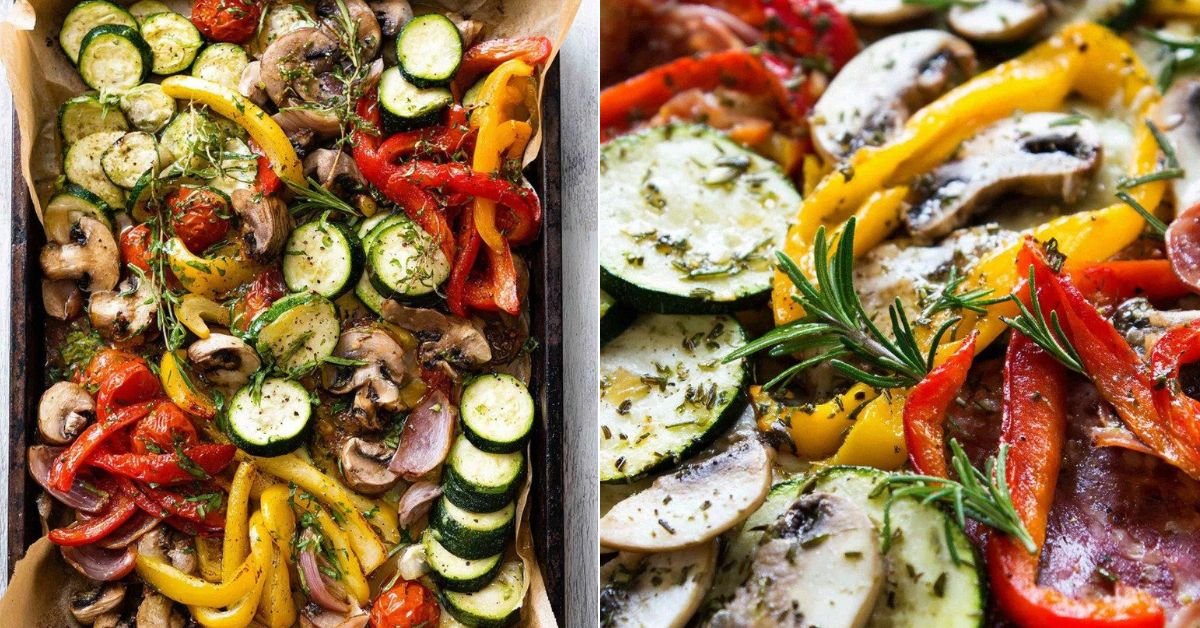 - Das marinierte Gemüse auf ein Backblech legen oder in einer Grillpfanne verteilen.