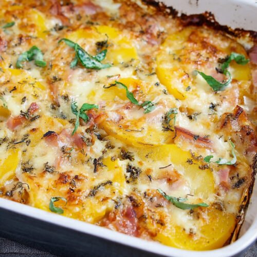 Das Gericht trägt cremige Schichten aus Kartoffeln und Schinken. Die Soße bindet mit Sahne Eier und Gewürzen. Der Käse liefert Bräune und eine zarte Kruste.