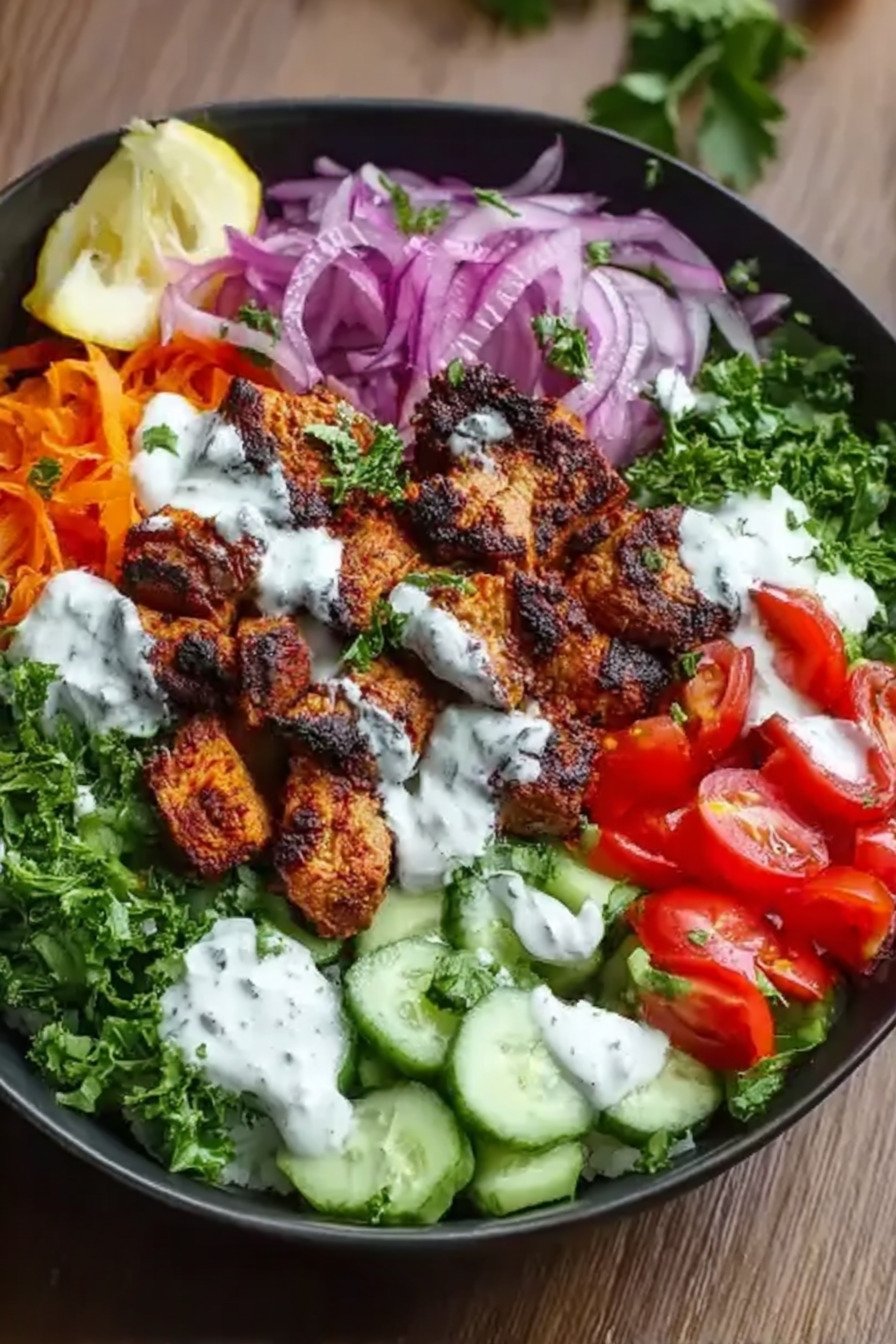 Die Basis liefert gleichmäßige Energie. Gemüse bringt Biss und Farbe. Gewürztes Protein gibt Halt. Eine Joghurt Soße verbindet alles zu einem runden Geschmack.