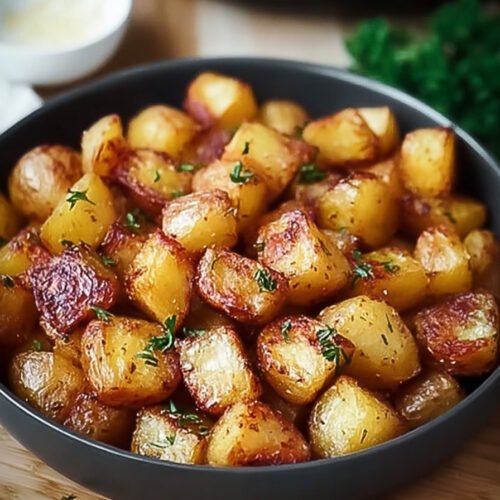 - Wenn die Kartoffeln goldbraun und knusprig sind, herausnehmen und mit frischer Petersilie garnieren.