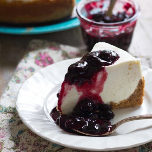 Schritt 5: Kurz vor dem Servieren die Blaubeersauce über den Käsekuchen geben oder separat dazu reichen.