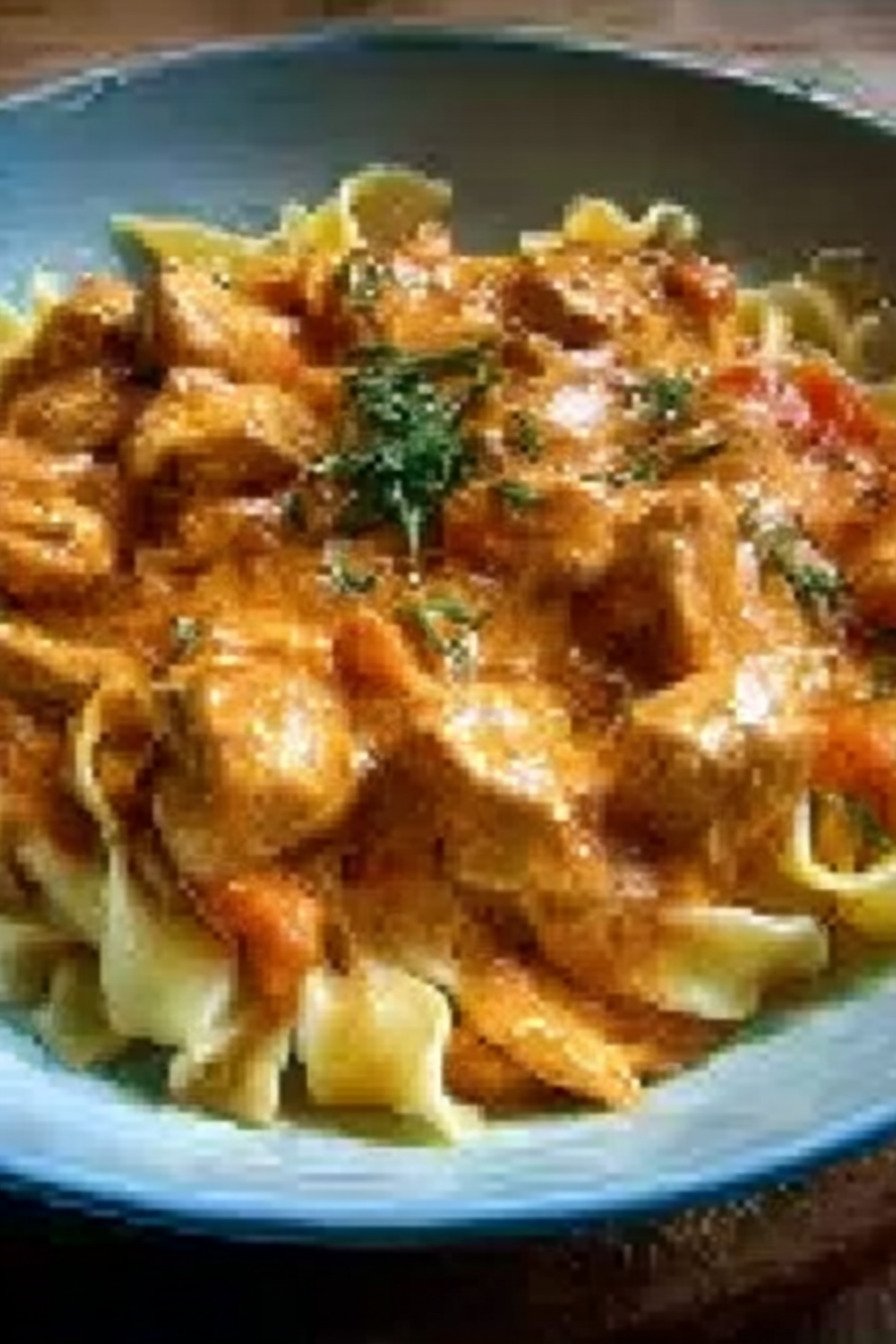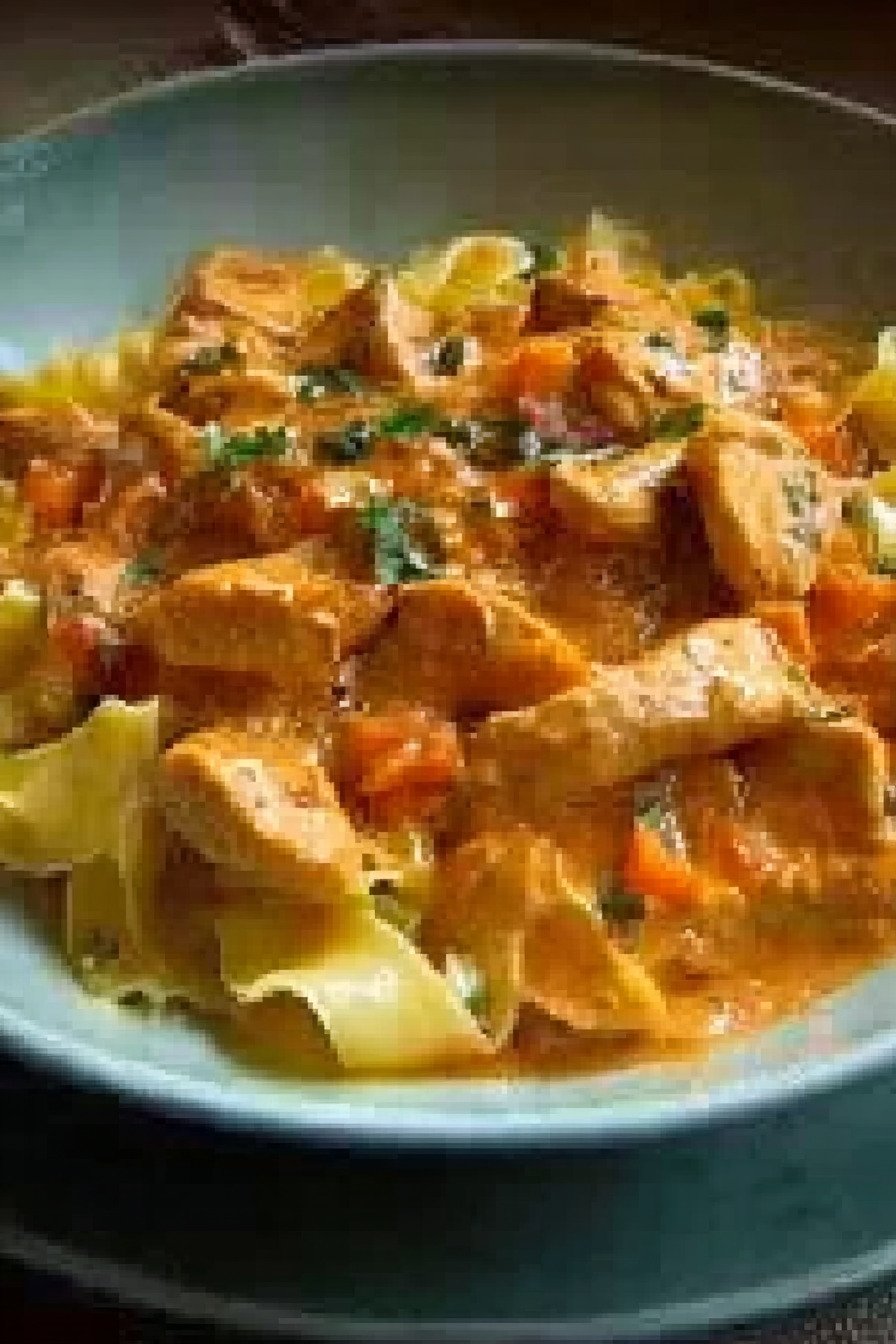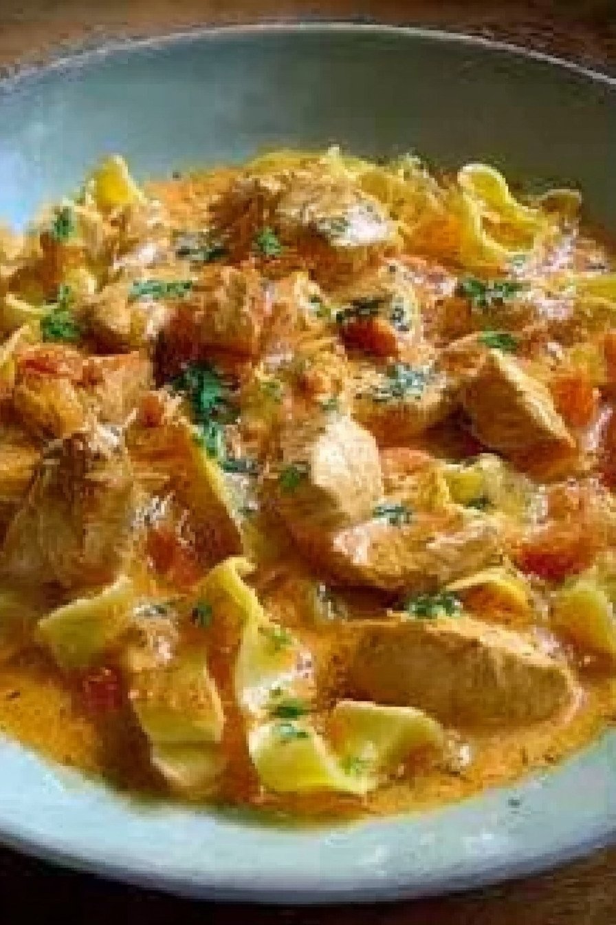 Dieses Rezept bringt cremiges Hähnchen und breite Nudeln zusammen. Die Soße bindet sanft und legt sich eng an jede Nudel. So entsteht klare Struktur und runder Geschmack.