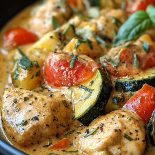 - Frische Zutaten wie Paprika und Zucchini verbinden sich mit Hähnchen in cremiger Sauce
