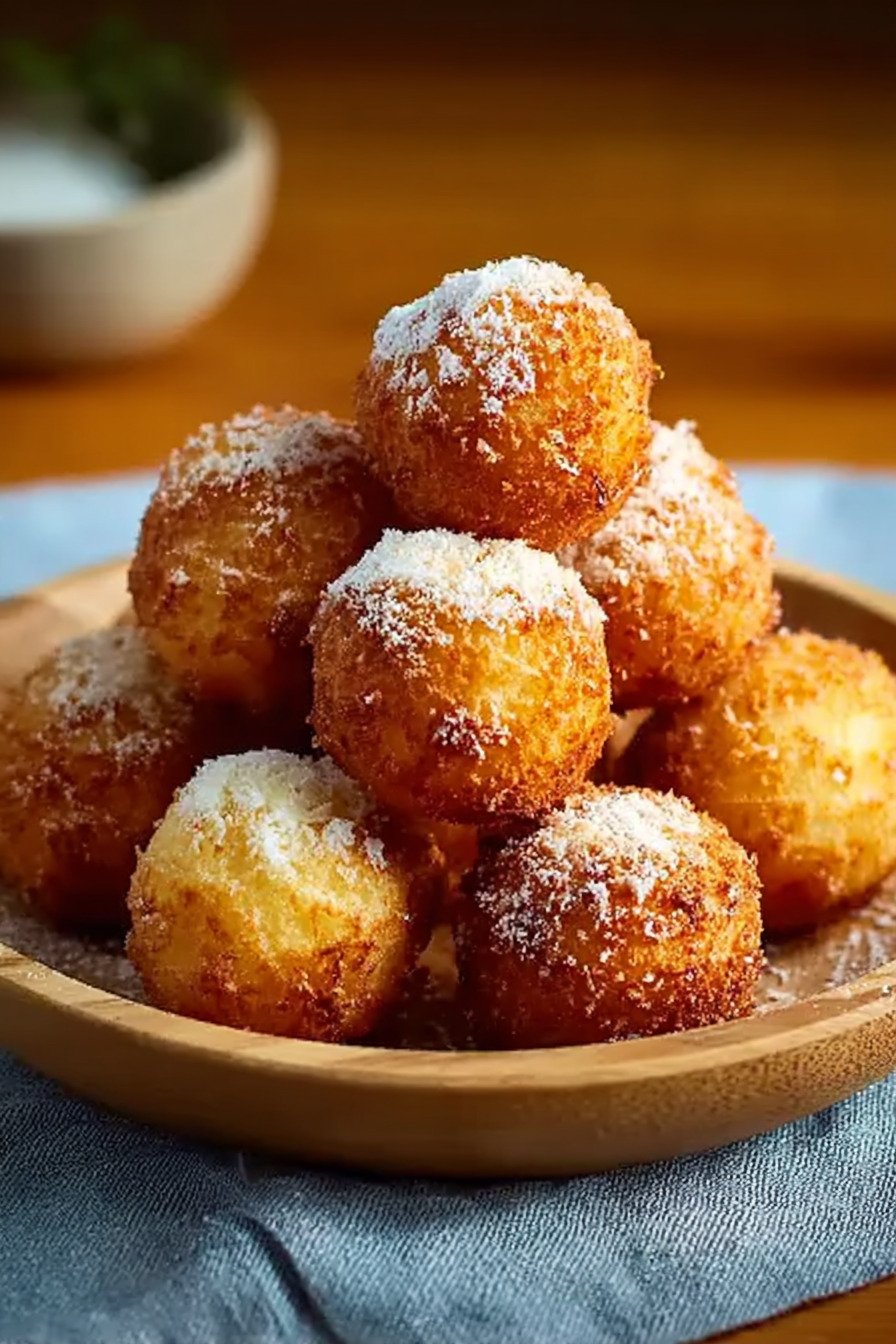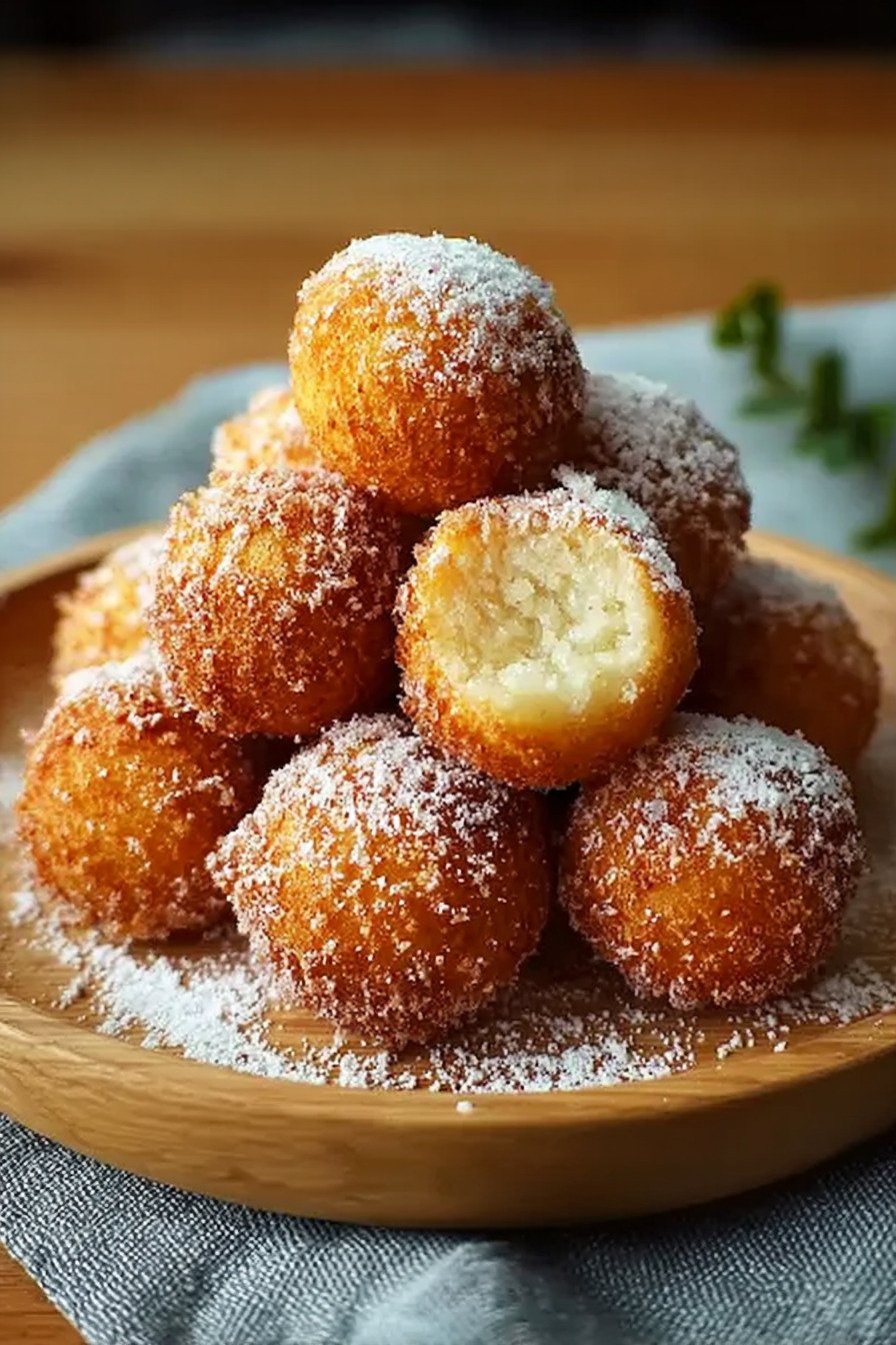 - Bällchen kurz auf einem Gitter abkühlen lassen. Mit Puderzucker bestäuben und warm servieren.