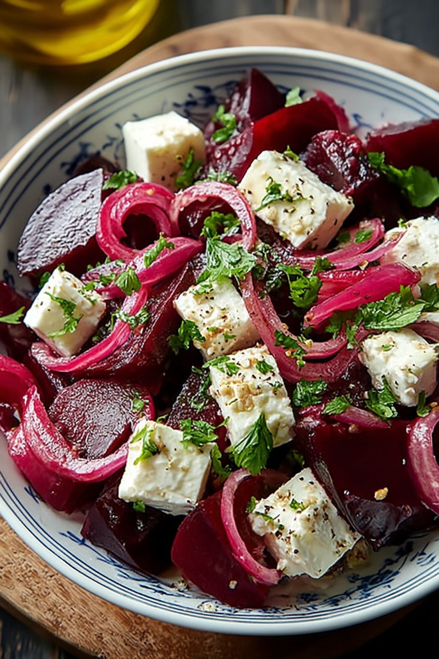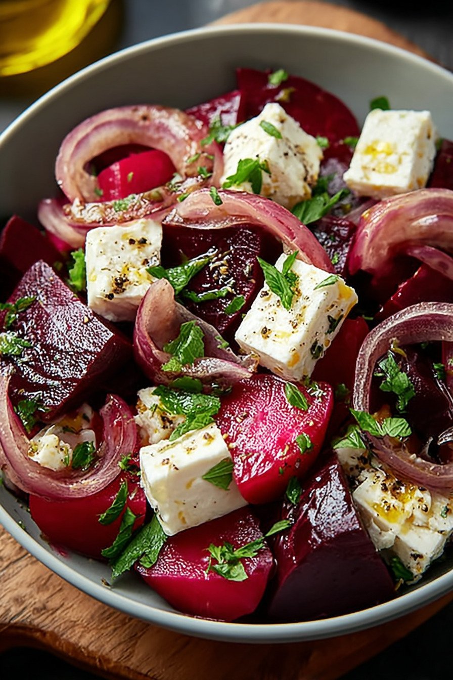- Rote Bete und Feta verbinden sich zu einem klaren Salat mit Würze und Frische.