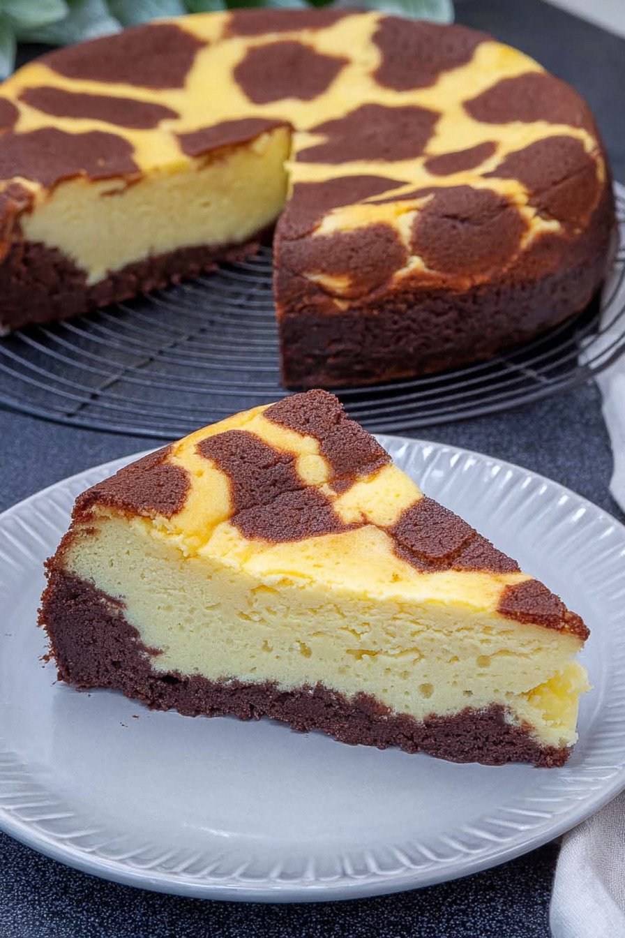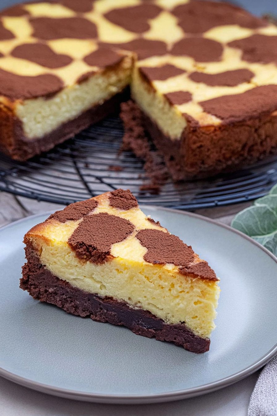 Der Boden trägt Kakao und liefert eine feine Kruste. Die Füllung besteht aus Quark Butter Zucker Eiern und Puddingpulver. Beides verbindet sich beim Backen zu weicher Creme mit zartem Biss.