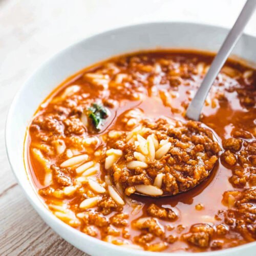 9) Einfache Kritharaki Suppe mit veganem Hack
