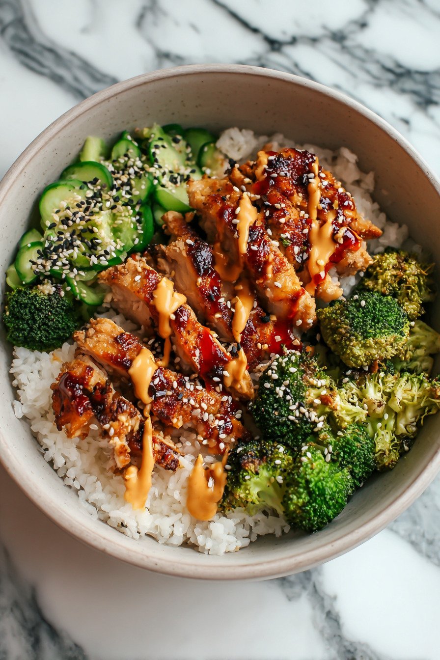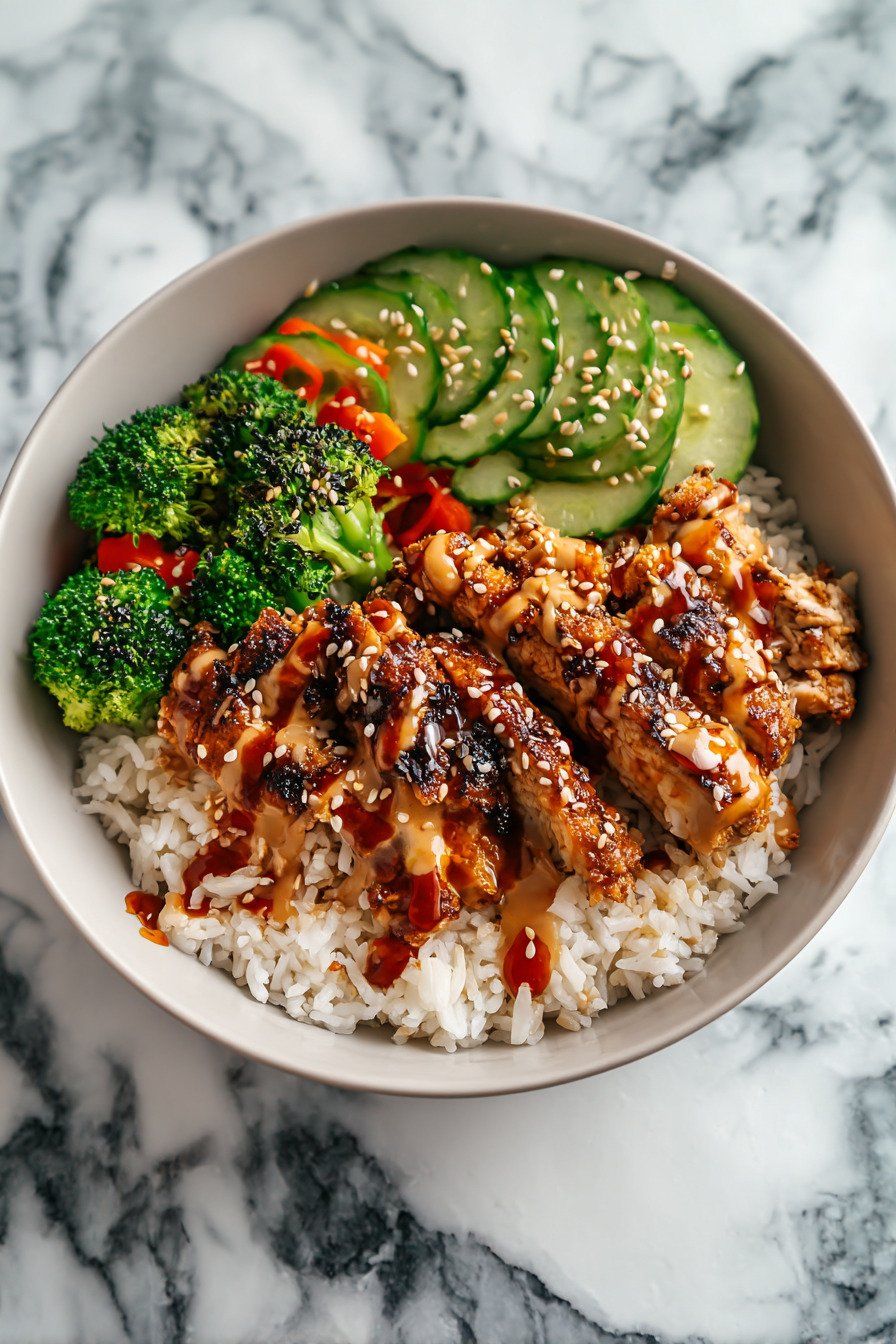- Saftig glasierte Hähnchenstücke auf warmem Reis mit knackigen Toppings