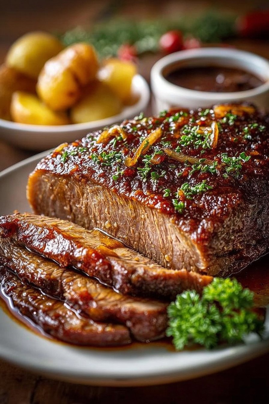 Serviere den Texanischen Rinderbraten mit Kartoffelpüree, Ofenkartoffeln oder frischem Brot. Diese Beilagen nehmen die würzige Sauce perfekt auf und machen das Gericht zu einem vollwertigen Hauptgericht.