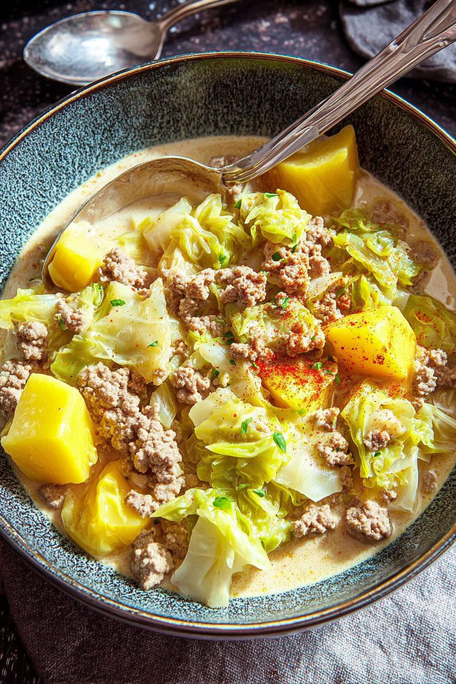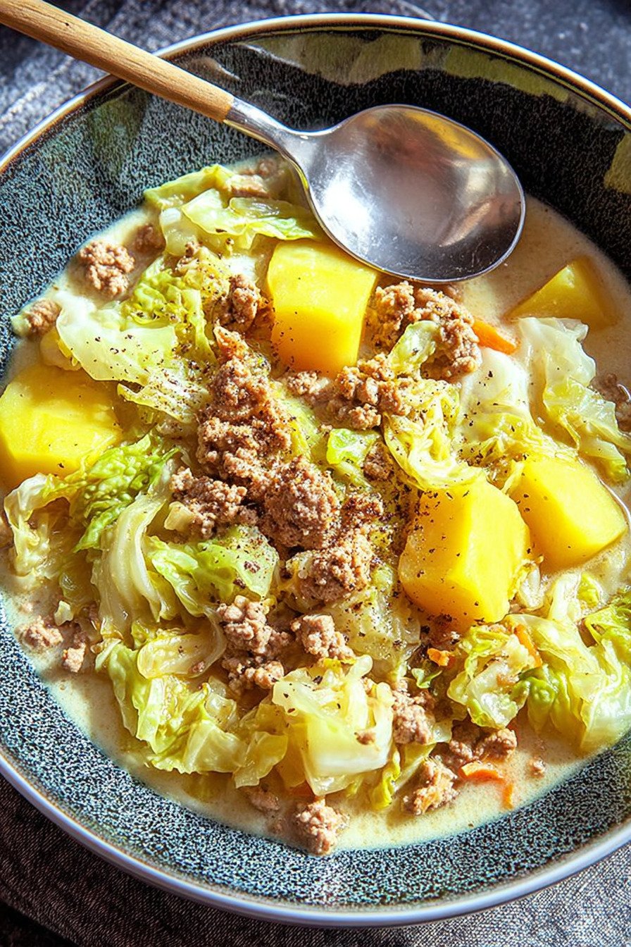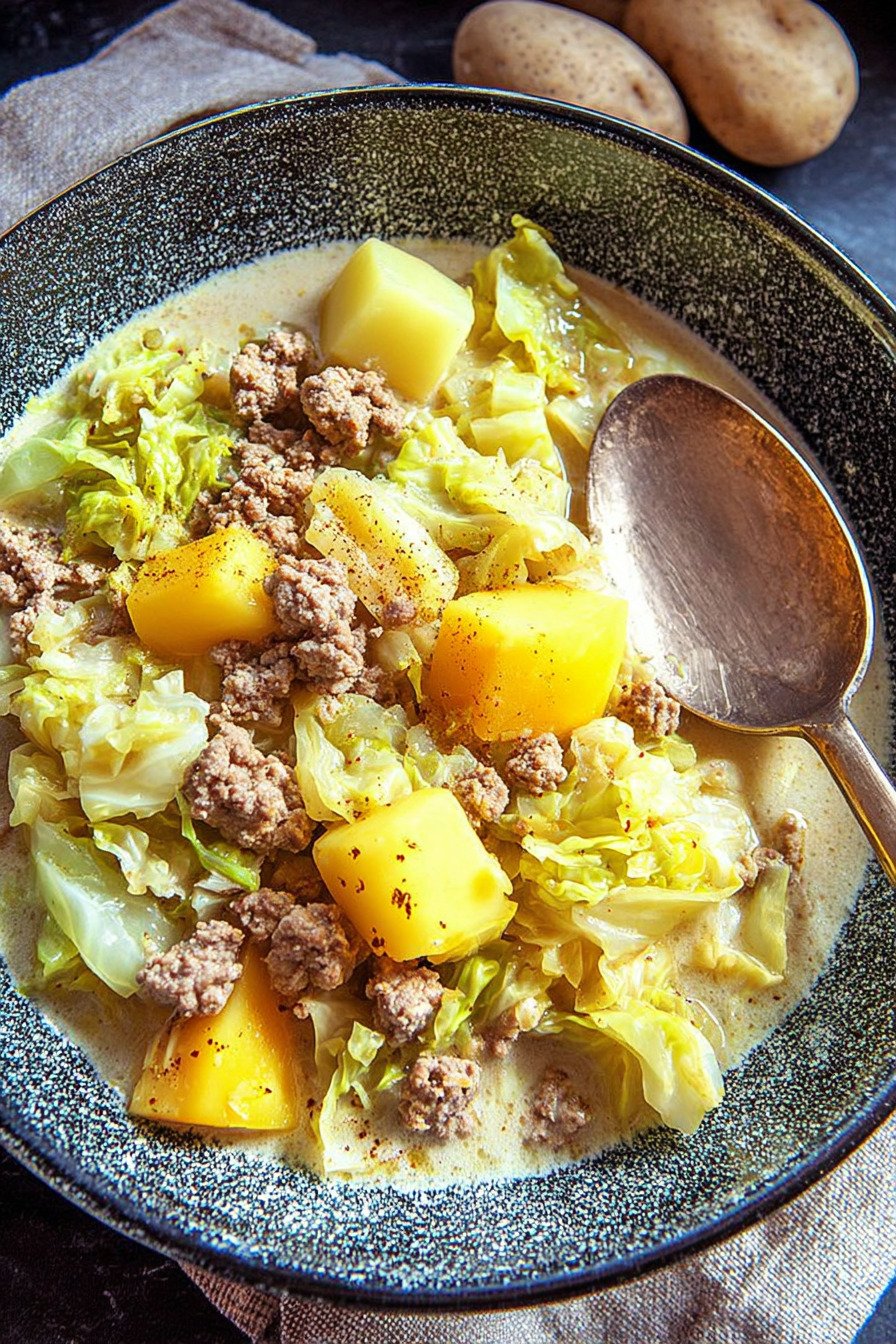 Dieser Eintopf wärmt. Wirsing trifft Kartoffeln und zartes Hackfleisch. Die Brühe bindet alles sanft.