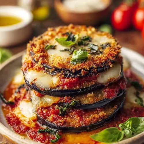Die Auberginenscheiben trocken tupfen und in einer heißen Pfanne oder im Ofen kurz anbraten, bis sie leicht gebräunt sind.