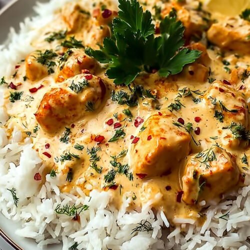 Alles ca. 10–15 Minuten köcheln lassen, bis das Hähnchen gar und die Sauce cremig ist.