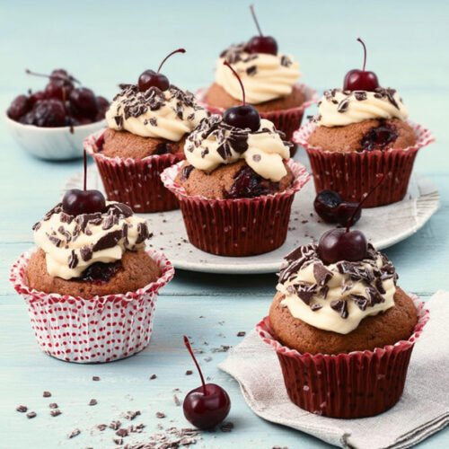 Muffins auskühlen lassen. Sahne mit Sahnesteif steif schlagen und auf die Muffins spritzen.