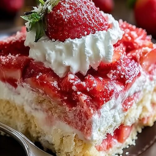 Frischkäse mit Puderzucker glatt rühren und mit einem Löffel portionsweise auf der Erdbeermischung verteilen.