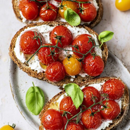 Tomaten waschen, halbieren und mit der Schnittfläche nach oben auf ein mit Backpapier belegtes Blech legen.