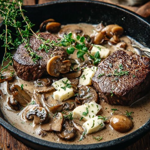 Die Rinderfilets zurück in die Sauce legen und kurz ziehen lassen.