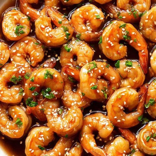 Sobald die Garnelen rosa und durchgegart sind, die Honig-Soja-Mischung hinzufügen.