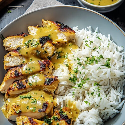Den Reis auf Teller verteilen, das Hähnchen mit der Sauce darauf geben und nach Wunsch mit Petersilie garnieren.