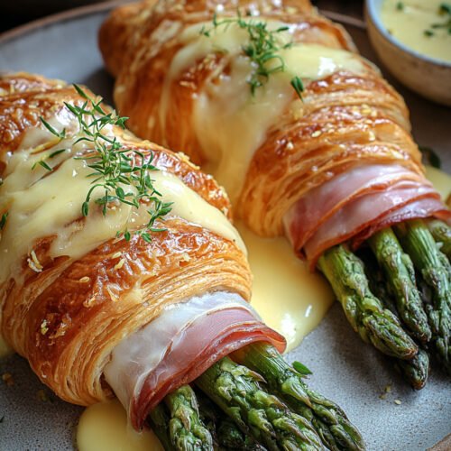 Jeweils zwei Stangen Spargel und eine Scheibe Schinken in die Croissants legen.