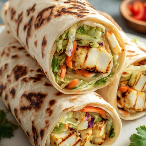 Die Wraps fest einrollen und nach Belieben halbieren.