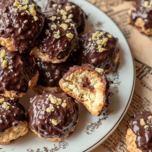 Die fertigen Rocher Plätzchen vollständig auskühlen lassen, bis die Schokolade fest ist.