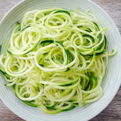 - Zucchini waschen und die Enden entfernen. Mit dem Spiralschneider zu Zoodles drehen.
